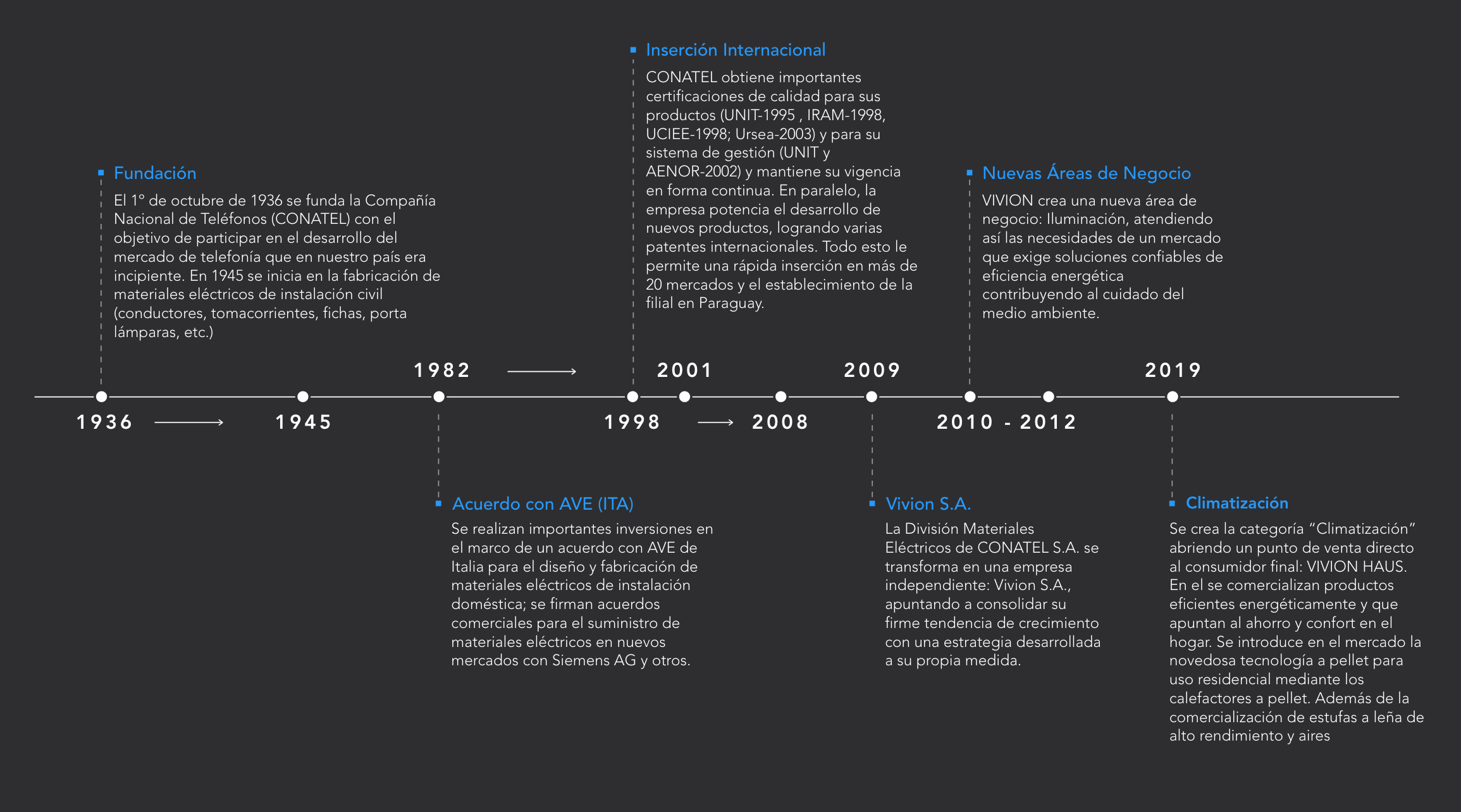 La historia de VIVION S.A. se remonta al pasado de la División de Materiales Eléctricos de la empresa CONATEL S.A. con más de 80 años de trayectoria y experiencia en el desarrollo, fabricación y comercialización de materiales eléctricos.
